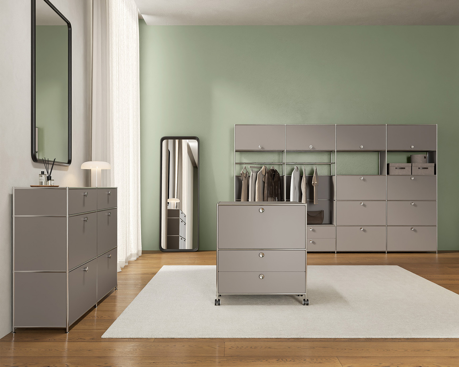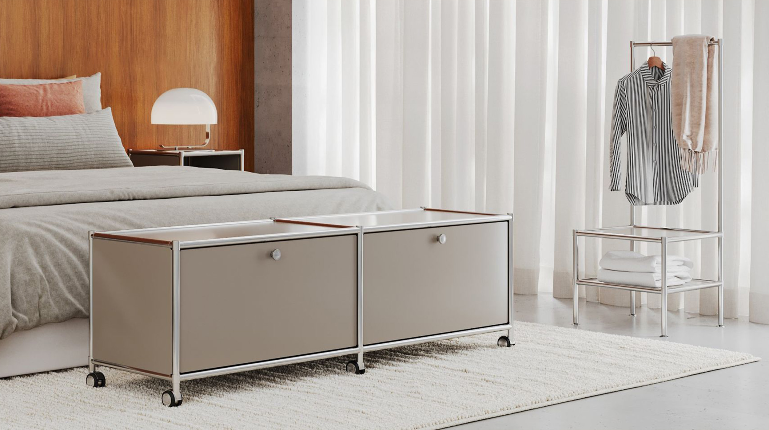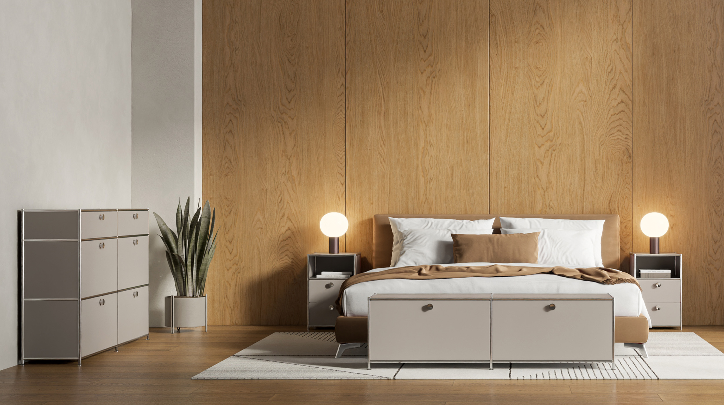 The modular system brings a sense of architectural calm to the bedroom and allows bits and bobs to be hidden behind clean lines. From the perfect bedside table to a well-organised wardrobe system, a structure emerges that allows the room to breathe and clears the mind for the night.