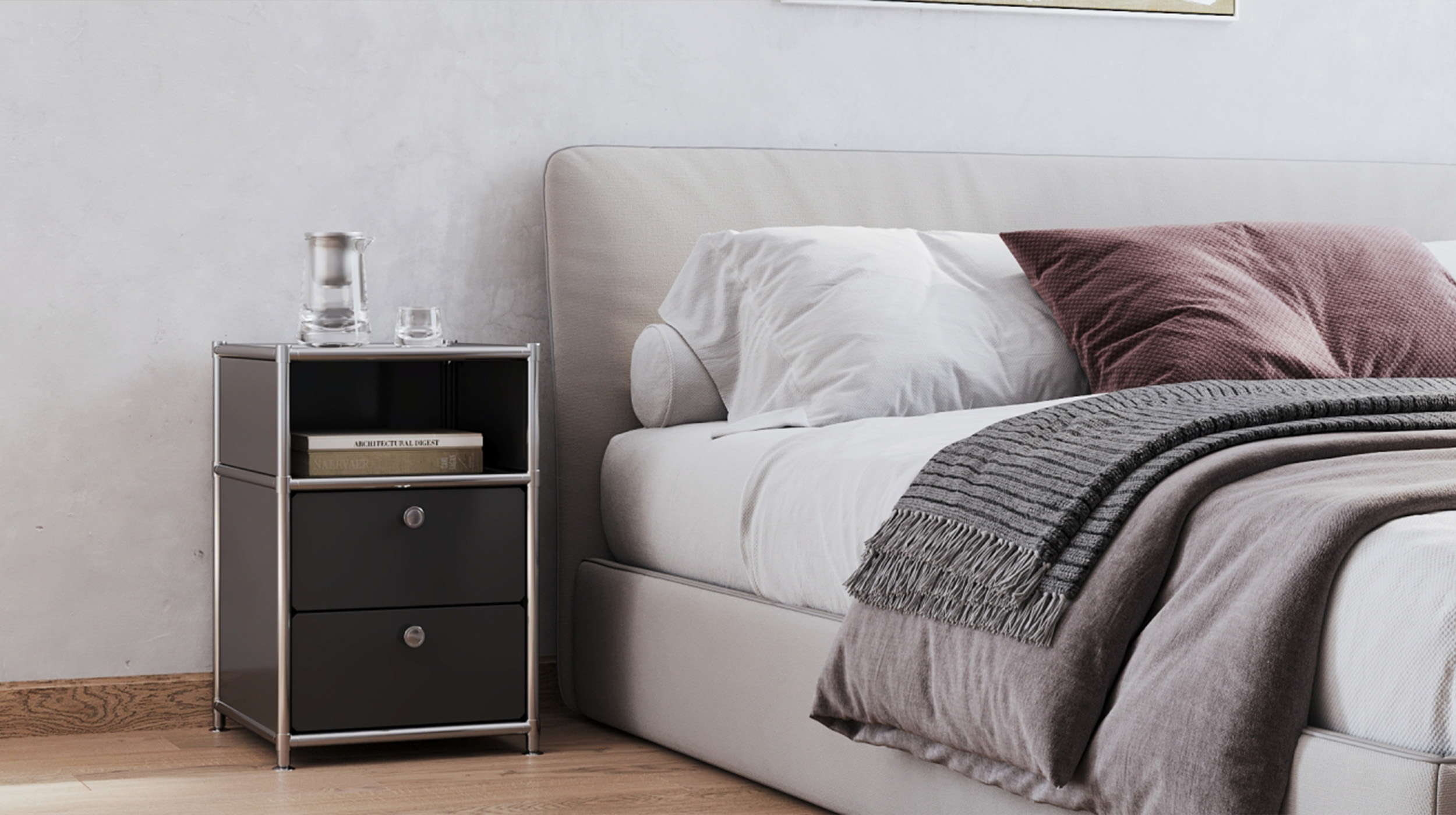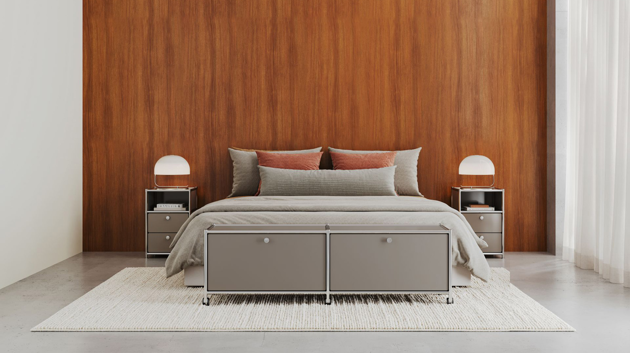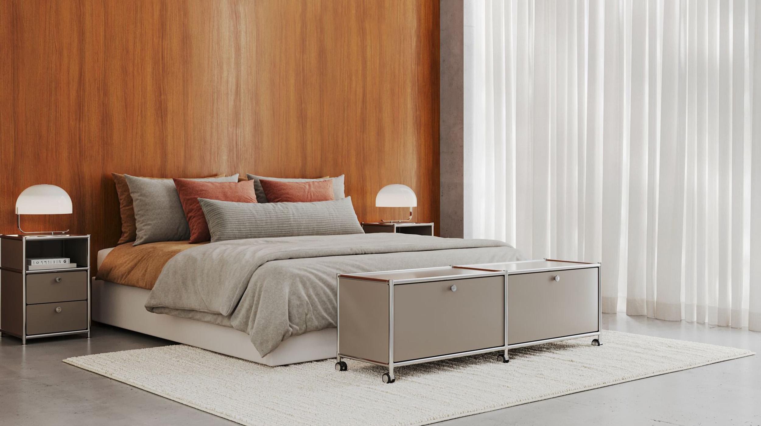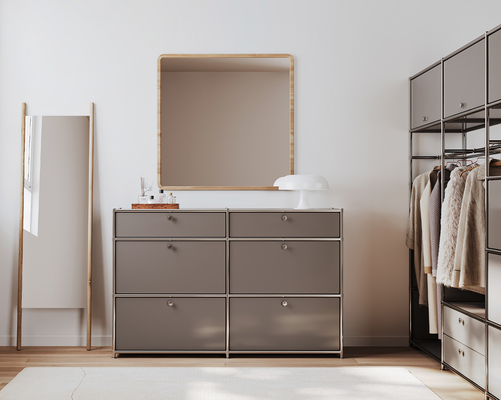 The modular system brings a sense of architectural calm to the bedroom and allows bits and bobs to be hidden behind clean lines. From the perfect bedside table to a well-organised wardrobe system, a structure emerges that allows the room to breathe and clears the mind for the night.