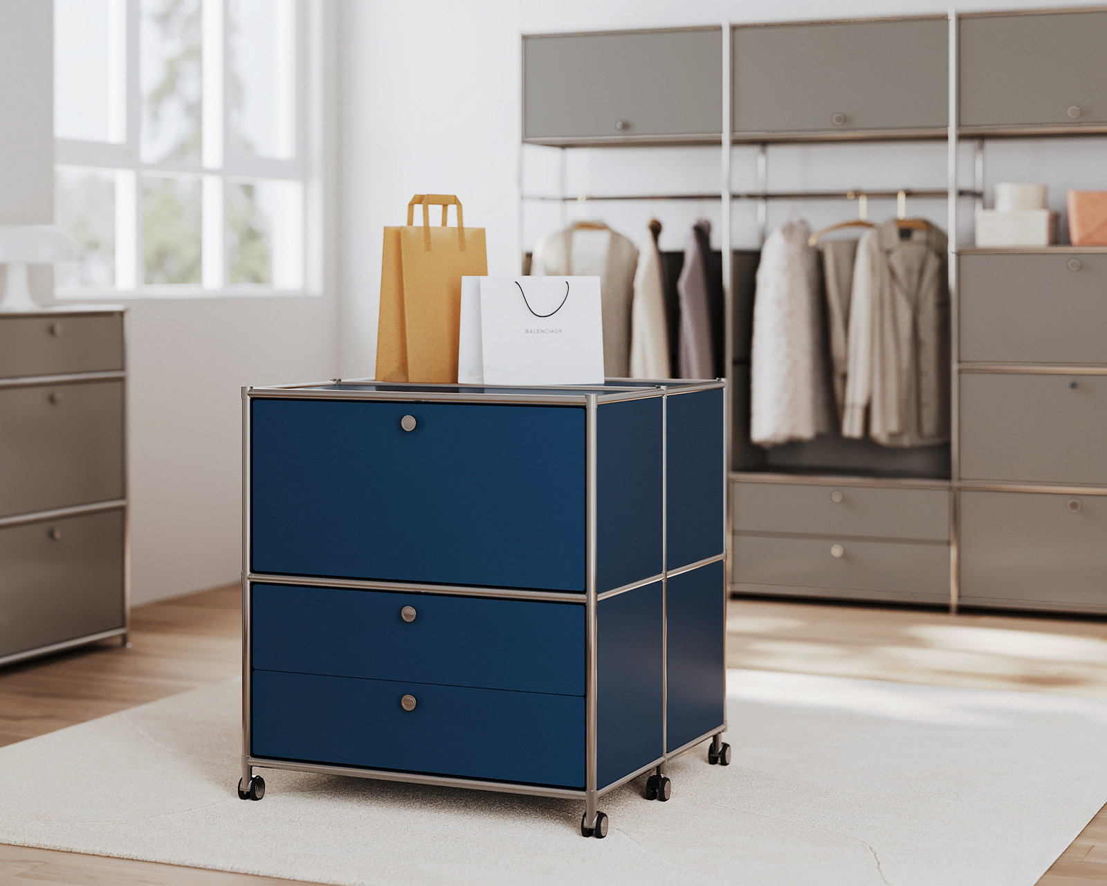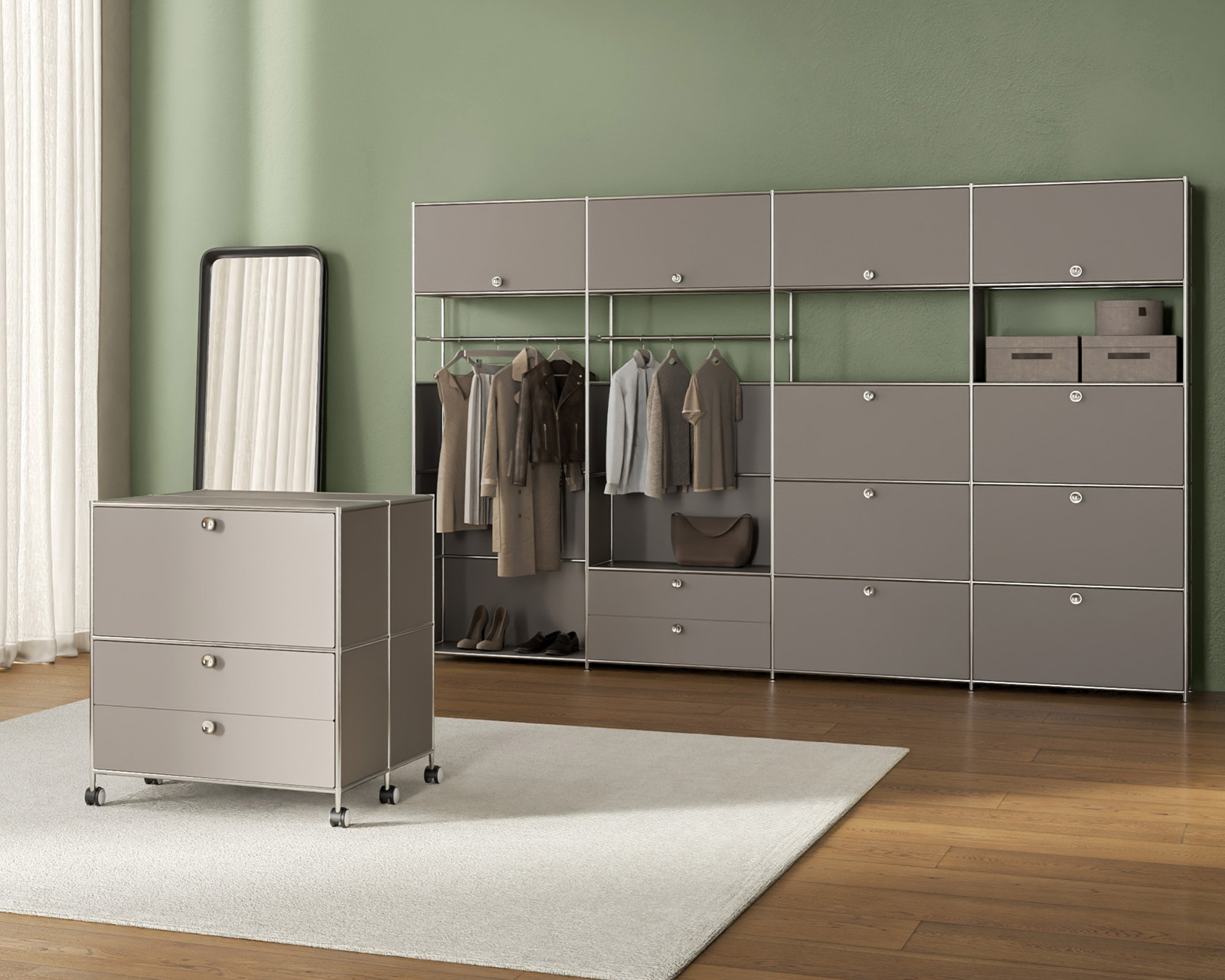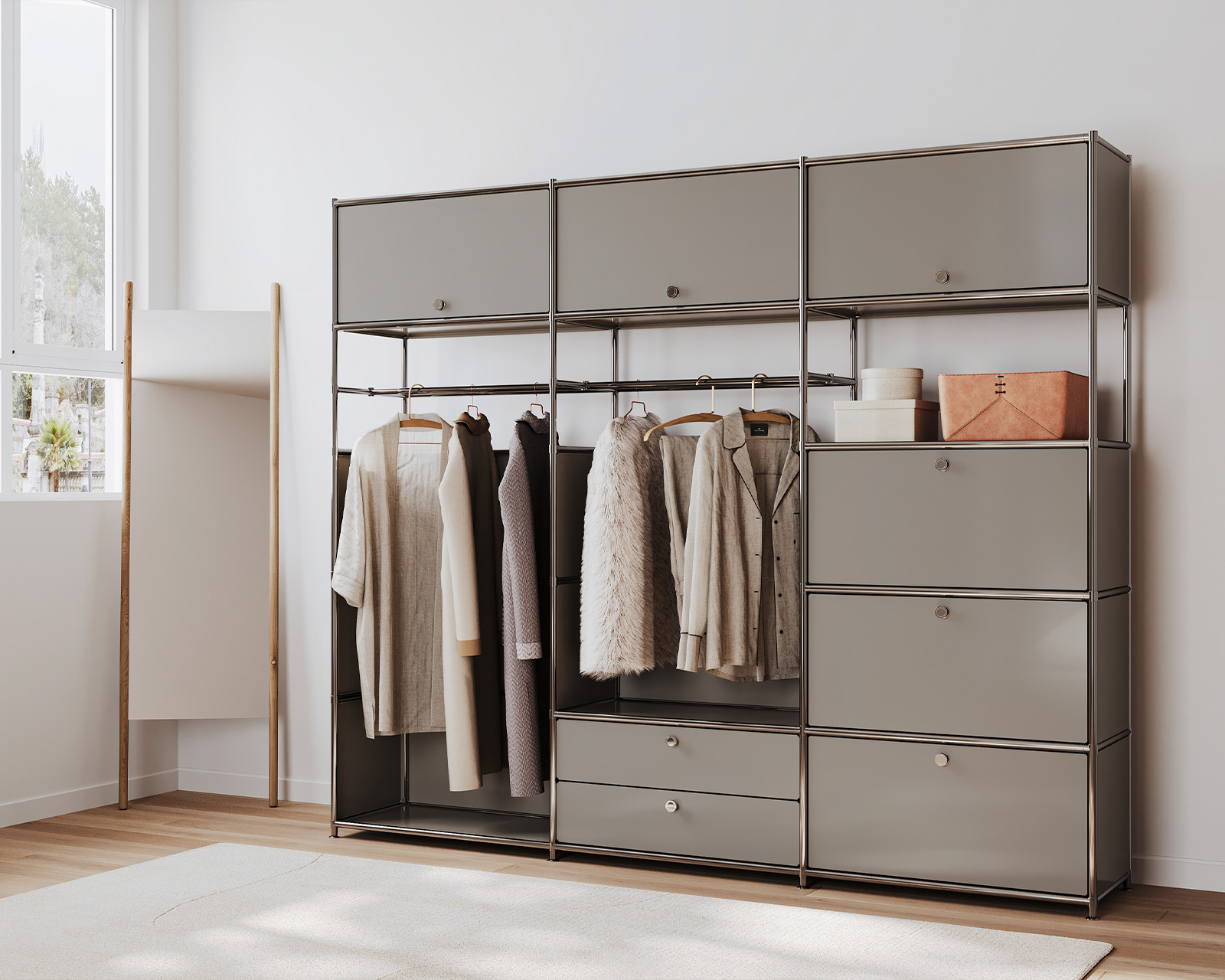 Thanks to the system’s design, every item of clothing is within easy reach and has its own designated place, even in large wardrobes. Different module heights allow you to create customised sections for shoes and accessories, ensuring a tidy appearance even with frequent use.