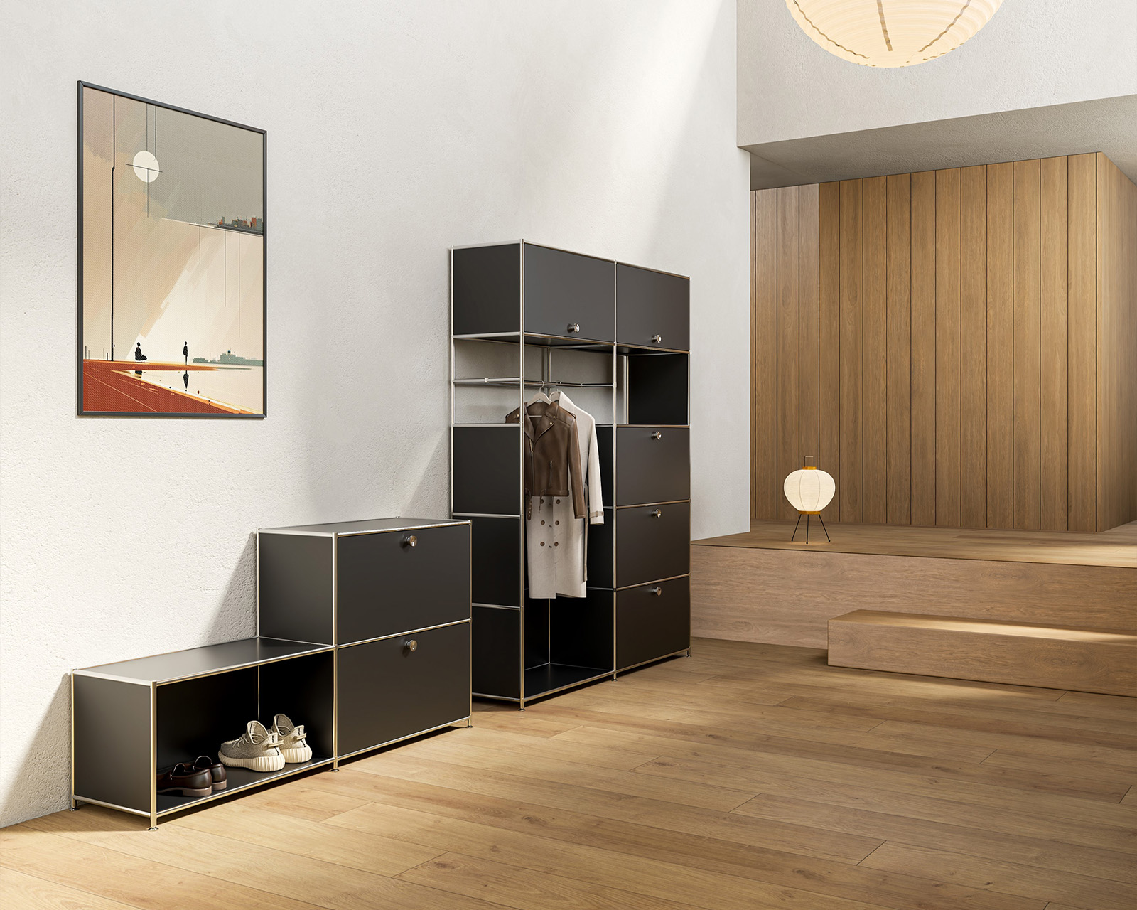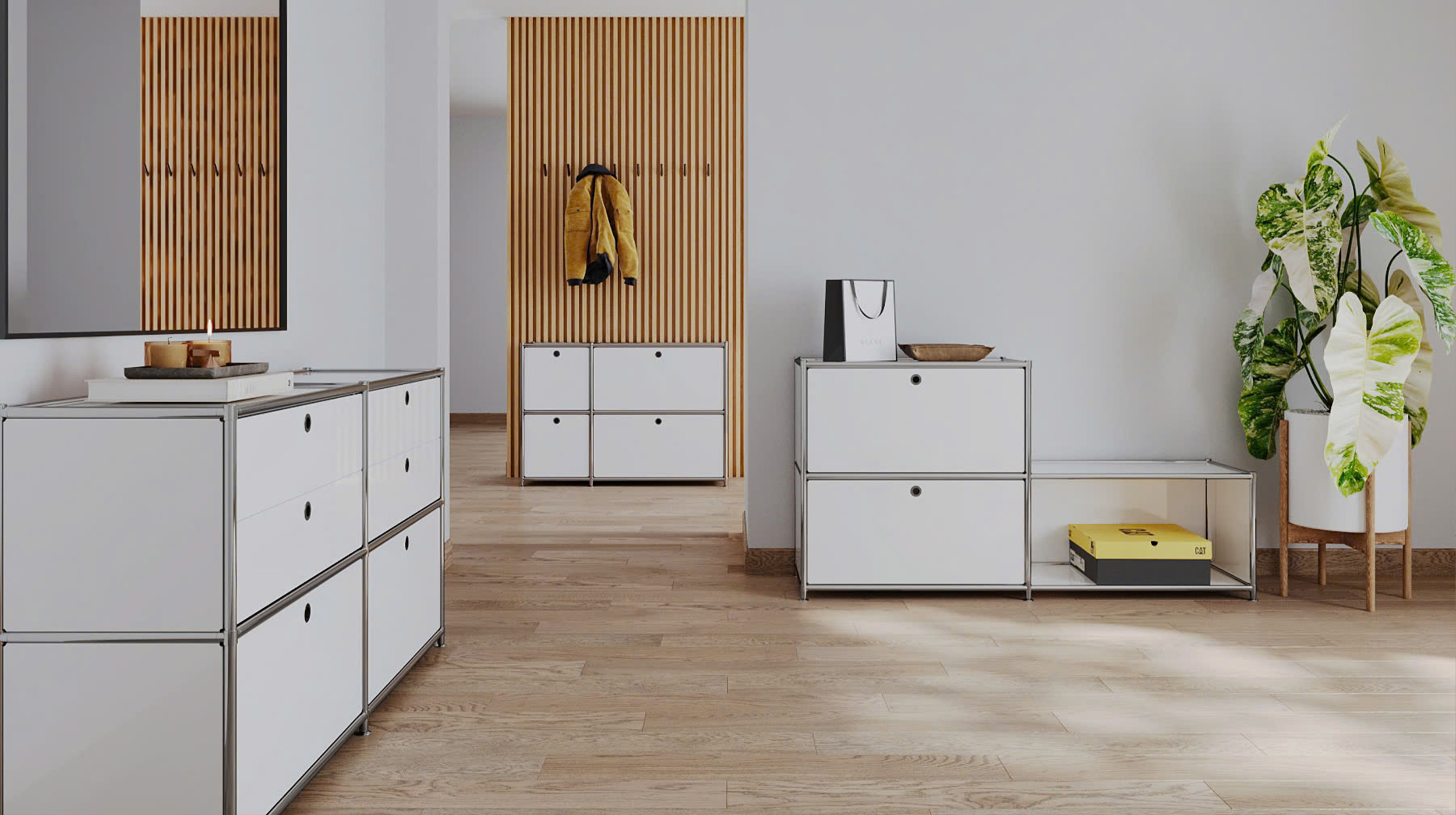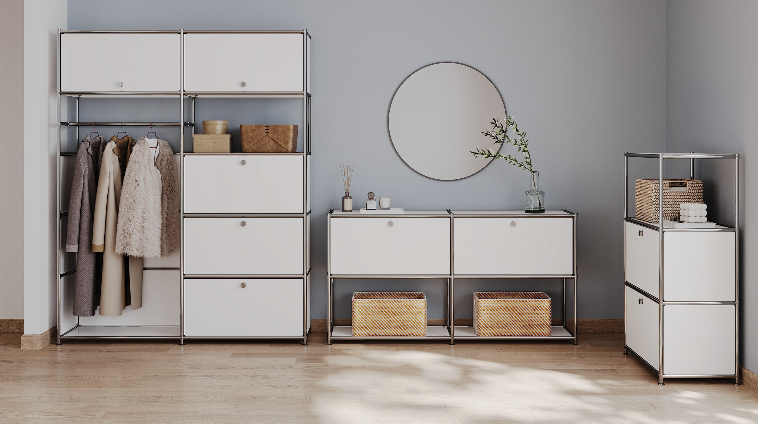 From a slim lowboard for your shoe collection to a wall-mounted coat rack: this modular system allows for maximum organisation in a minimal amount of space – perfect for everything that needs to be within easy reach when leaving the home.