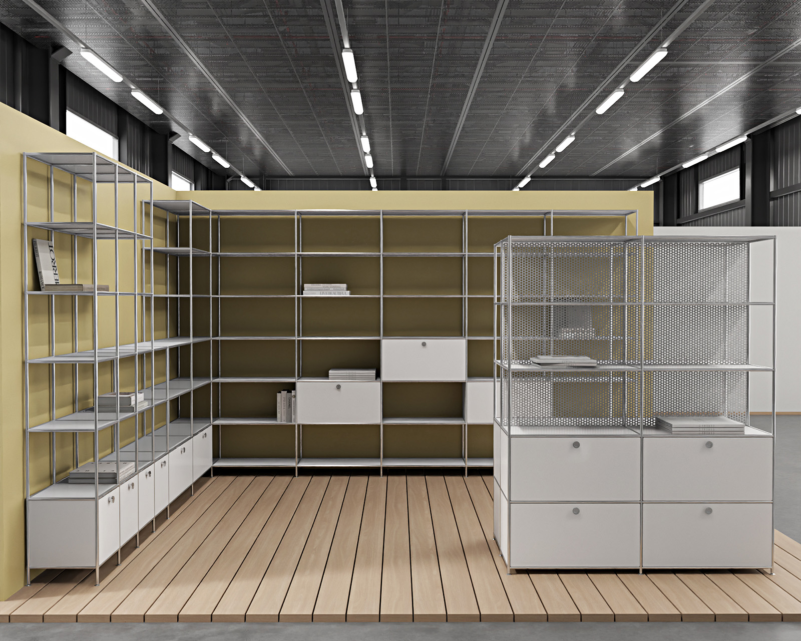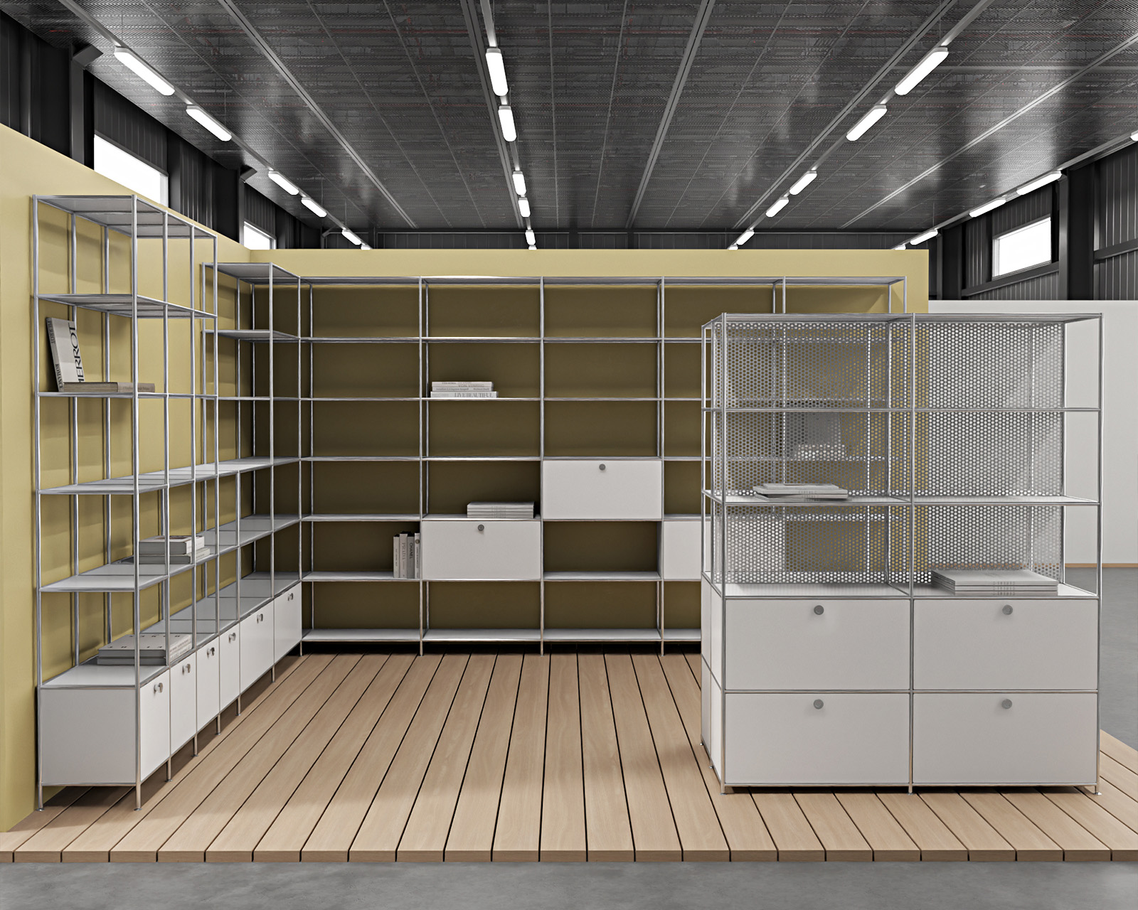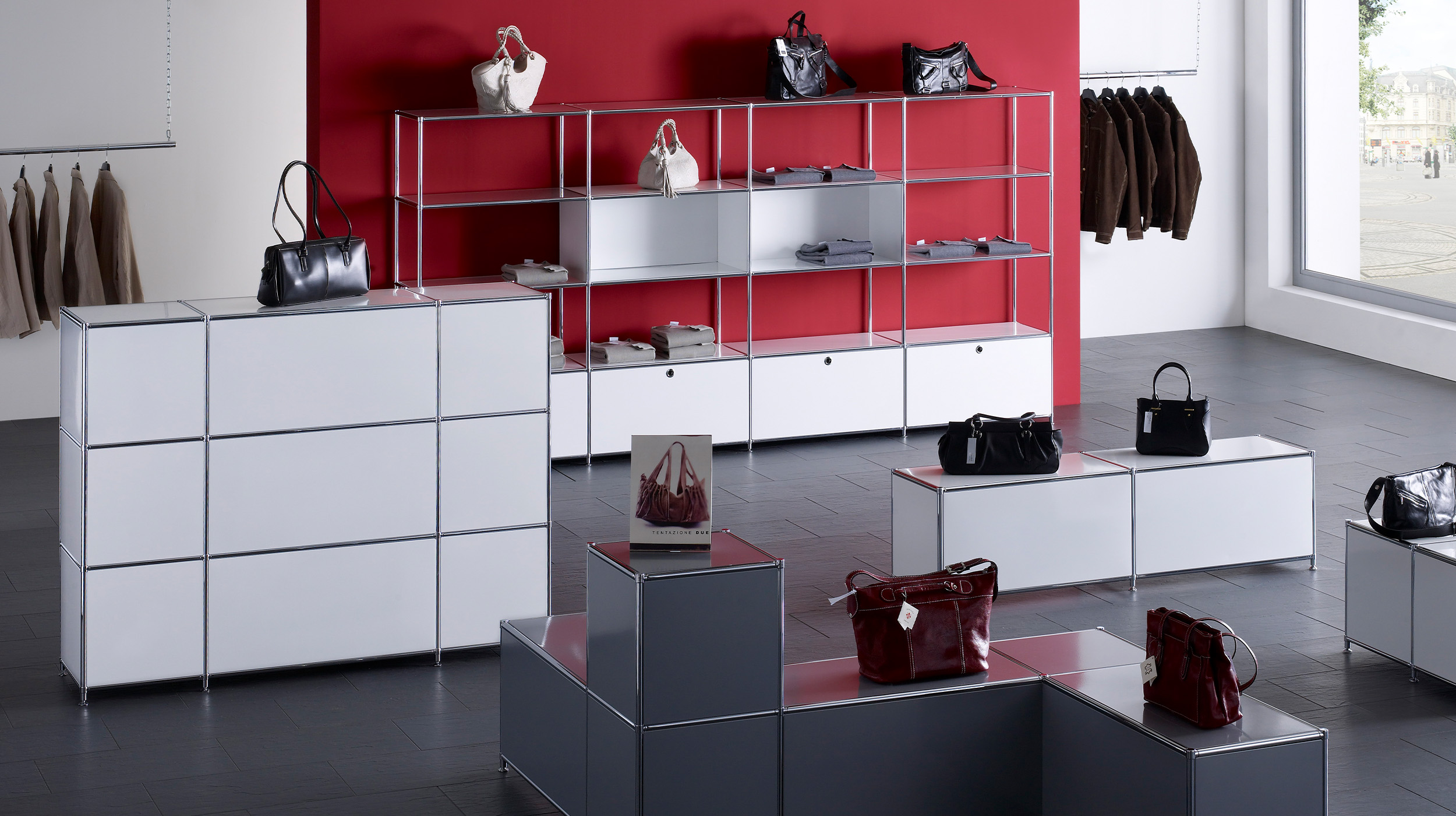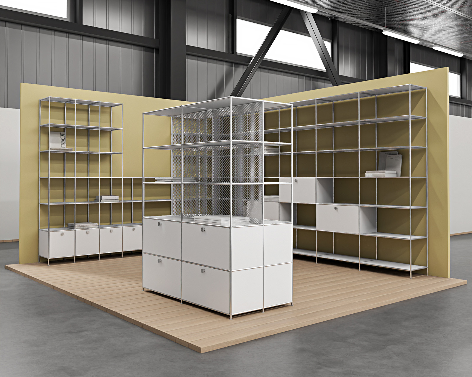 The modular design combines storage space and display areas into a distinctive whole. The consistent design language creates a confident presence that emphasises professionalism and quality effectively; it conveys reliability while allowing enough flexibility to redesign the space time and again without losing sight of the overarching theme.