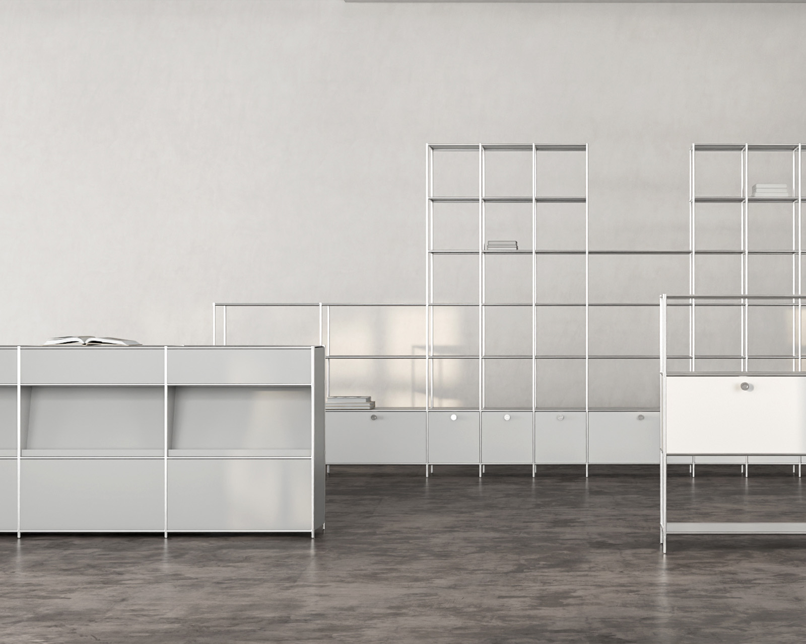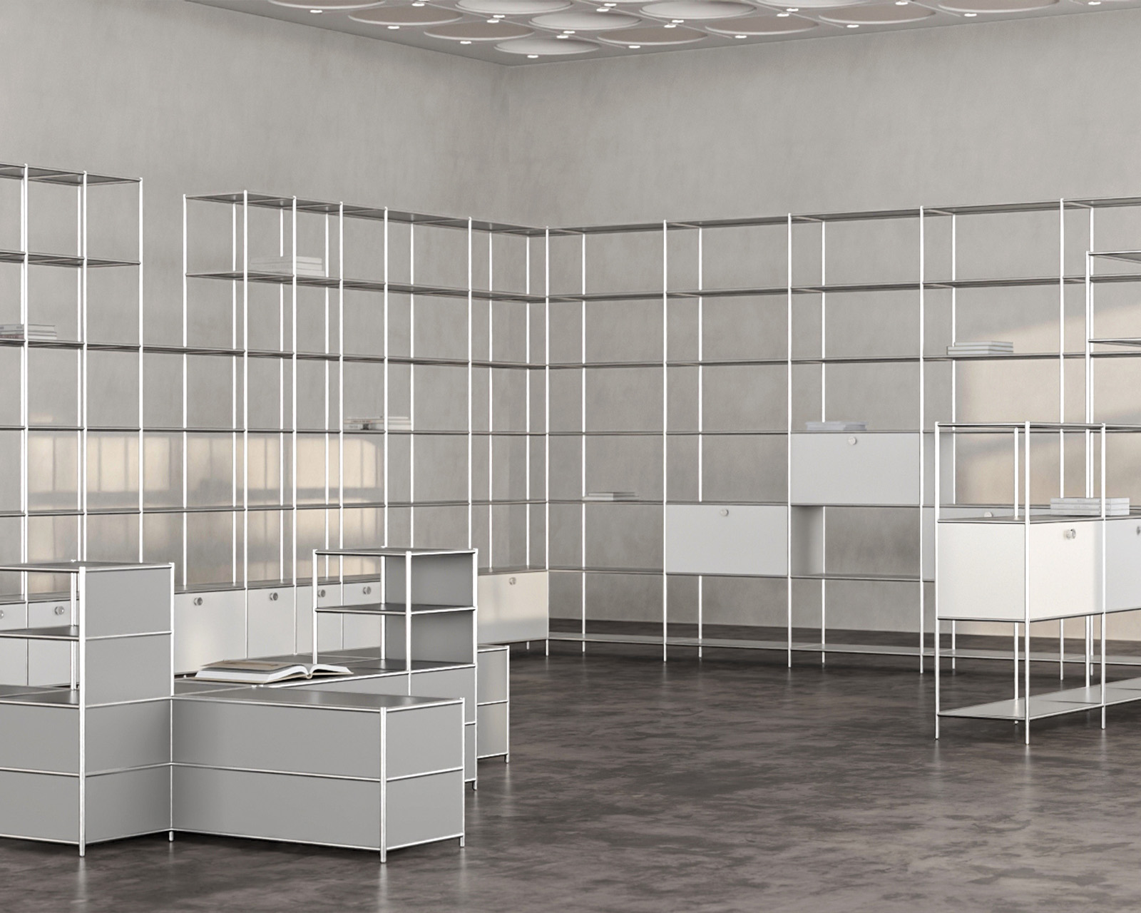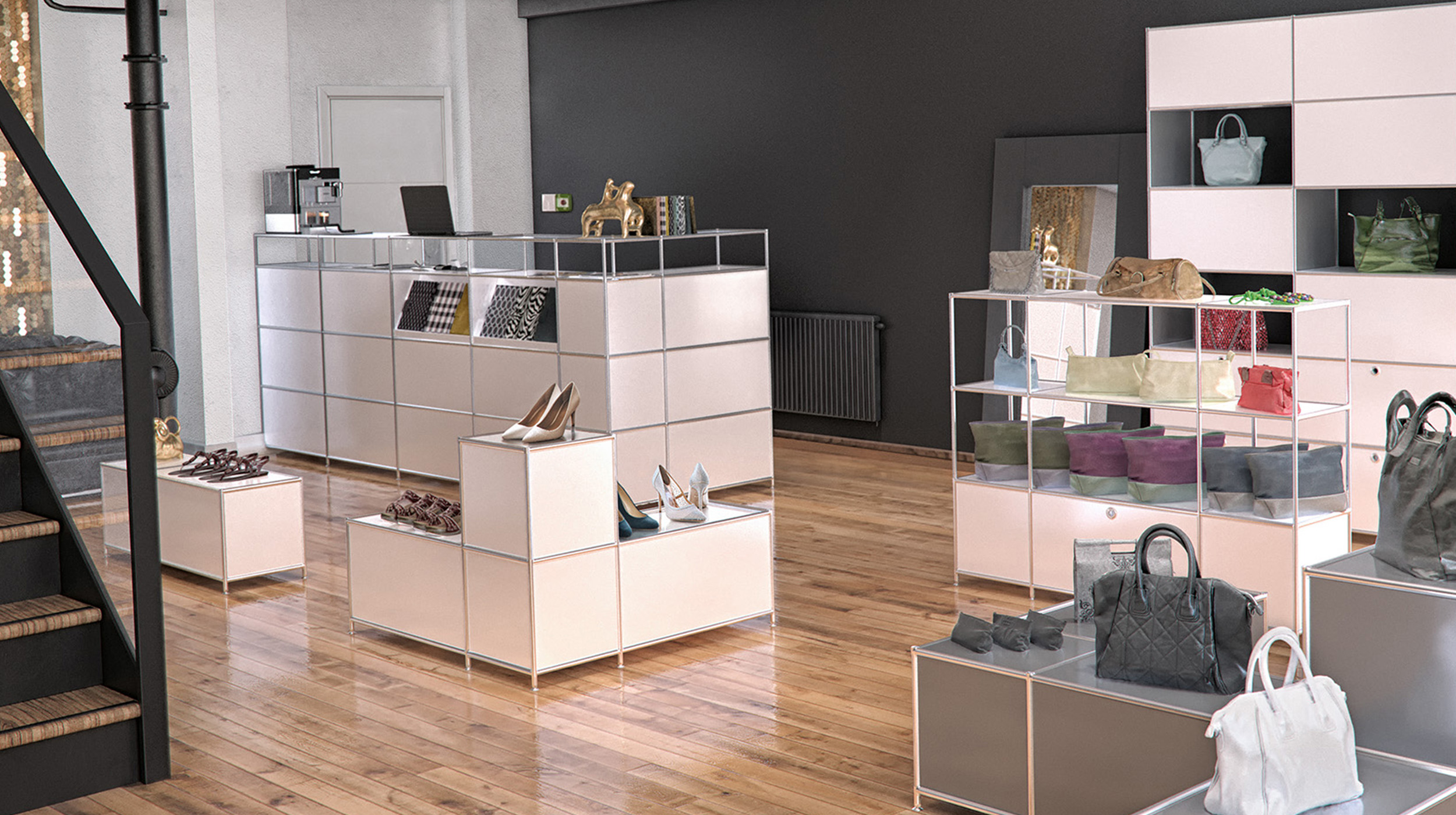 The modular design combines storage space and display areas into a distinctive whole. The consistent design language creates a confident presence that emphasises professionalism and quality effectively; it conveys reliability while allowing enough flexibility to redesign the space time and again without losing sight of the overarching theme.