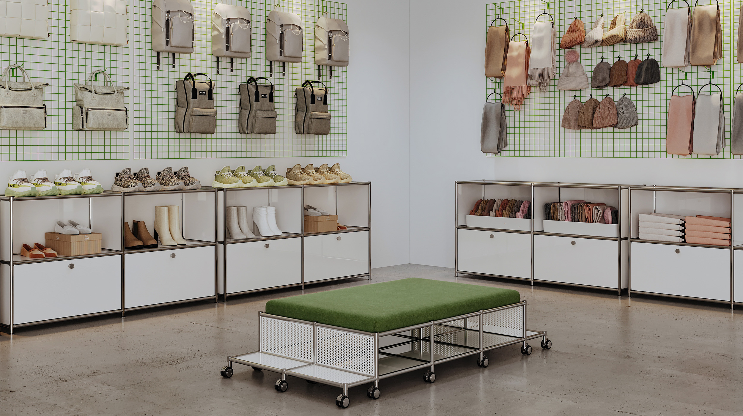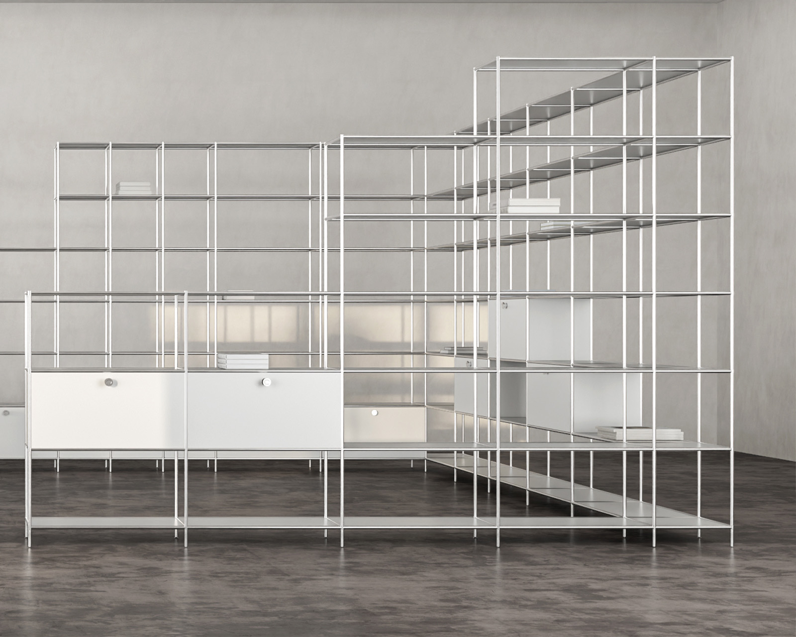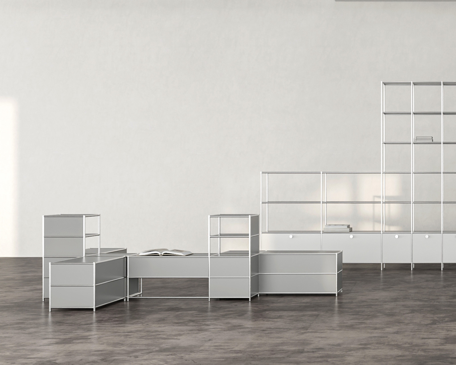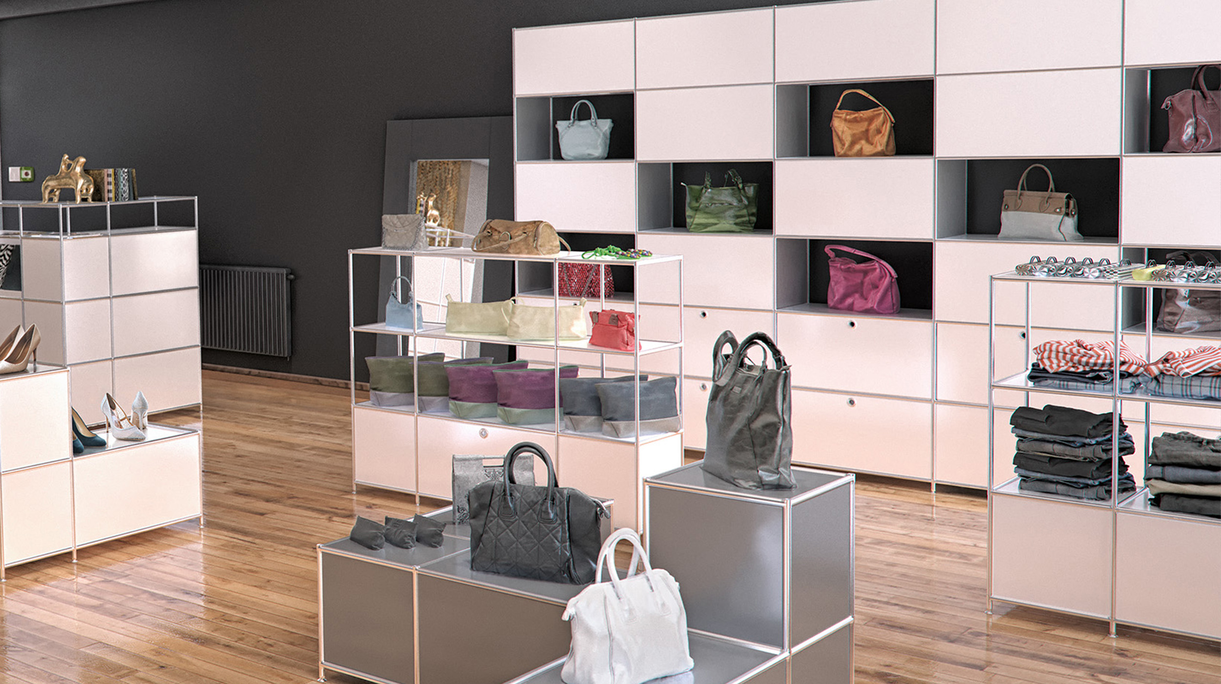 The modular design combines storage space and display areas into a distinctive whole. The consistent design language creates a confident presence that emphasises professionalism and quality effectively; it conveys reliability while allowing enough flexibility to redesign the space time and again without losing sight of the overarching theme.
