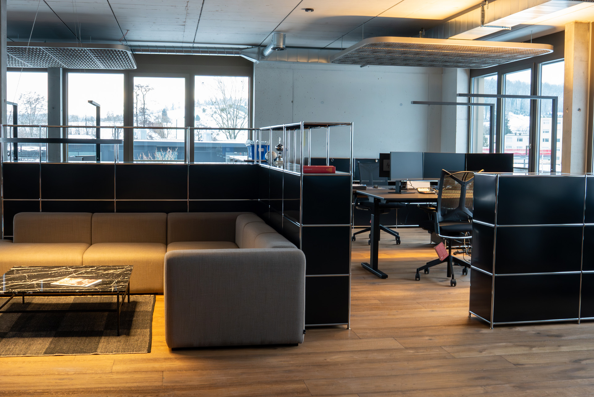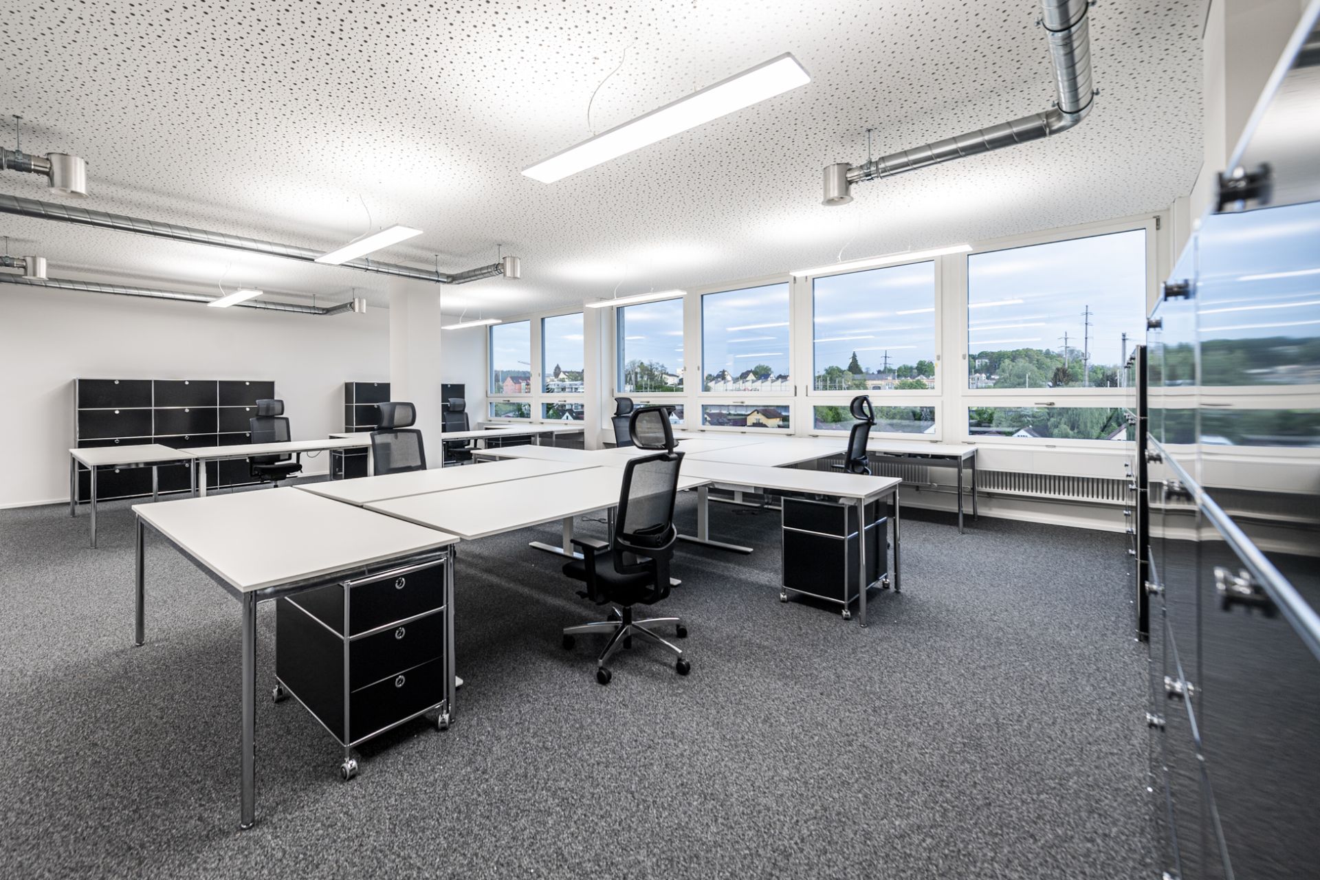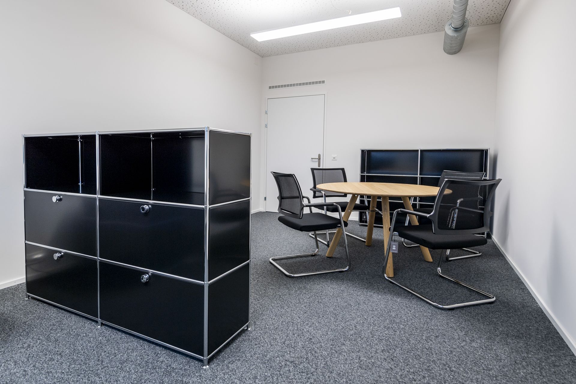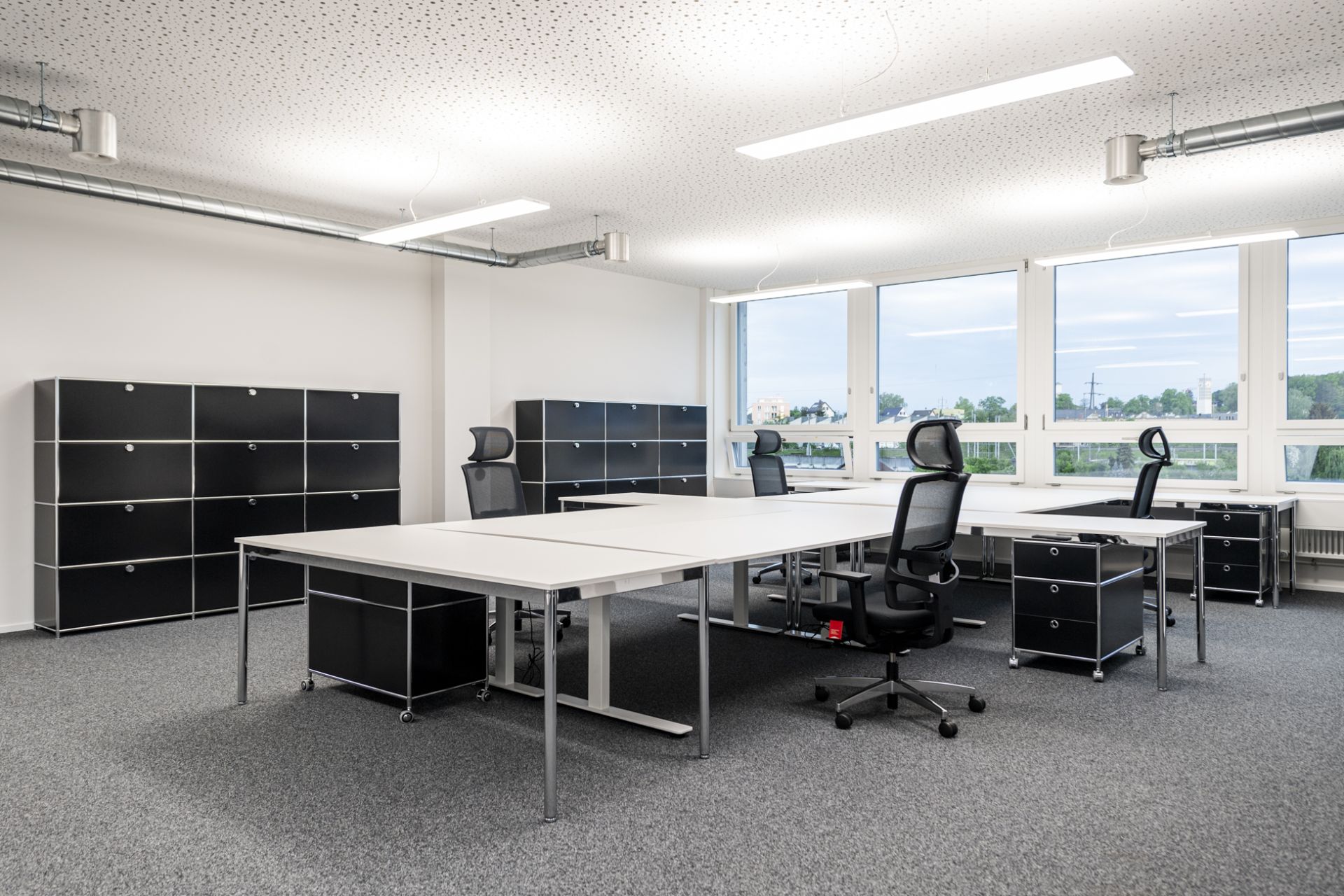 The project comprised twelve ergonomic workstations with height-adjustable desks, office containers and sideboards. Several dividing shelves provide structure and a clear room layout. The furnishings were complemented by a modern meeting room with a sideboard, a spacious table and chairs, an inviting dining area and two stylish lounge areas with a sofa and coffee table.