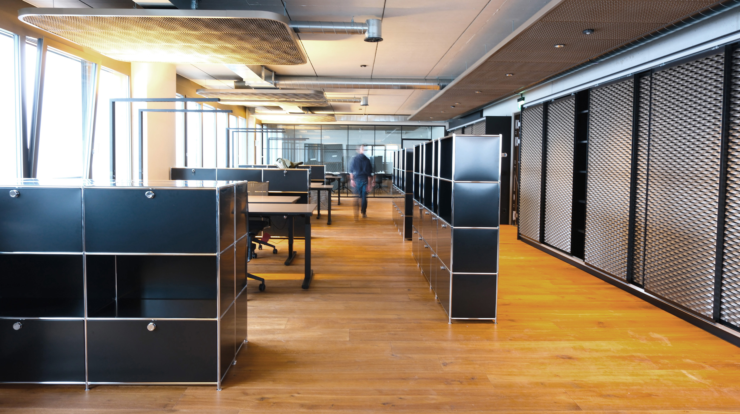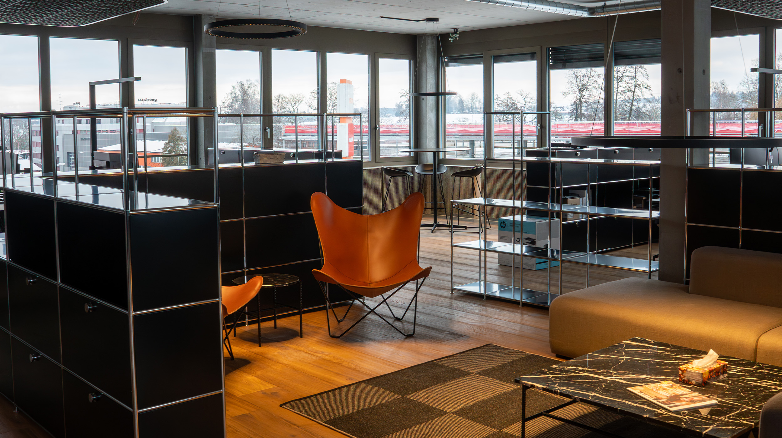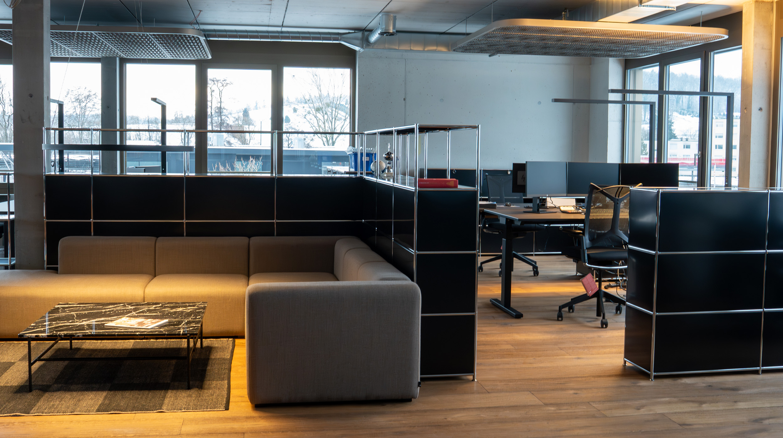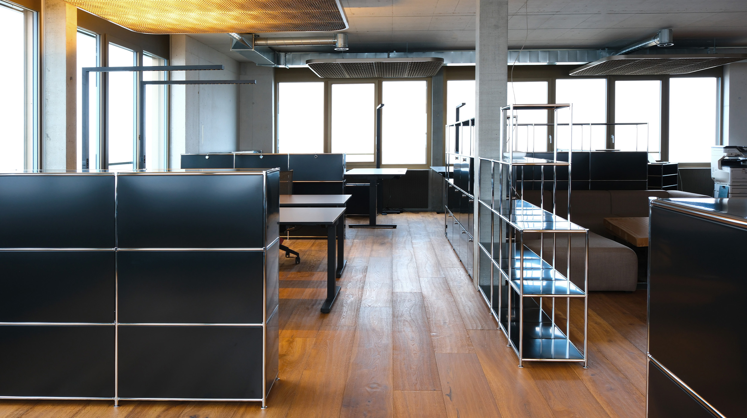 Das Projekt umfasst zwölf ergonomische Arbeitsplätze mit höhenverstellbaren Tischen, Bürocontainern und Sideboards. Trennregale organisieren den Raum. Ergänzt wird die Einrichtung durch ein Sitzungszimmer, einen Essbereich sowie zwei Loungebereiche.