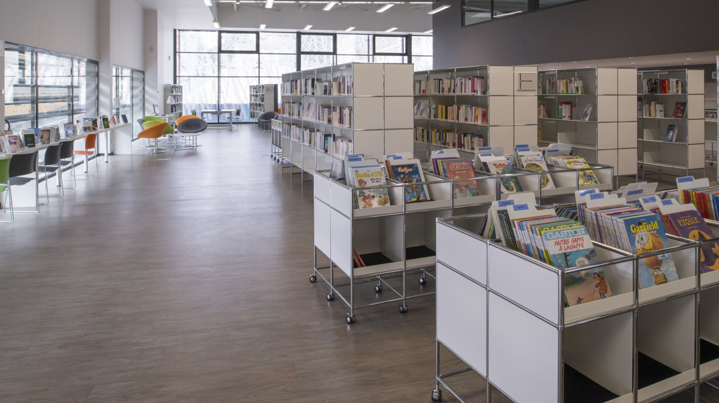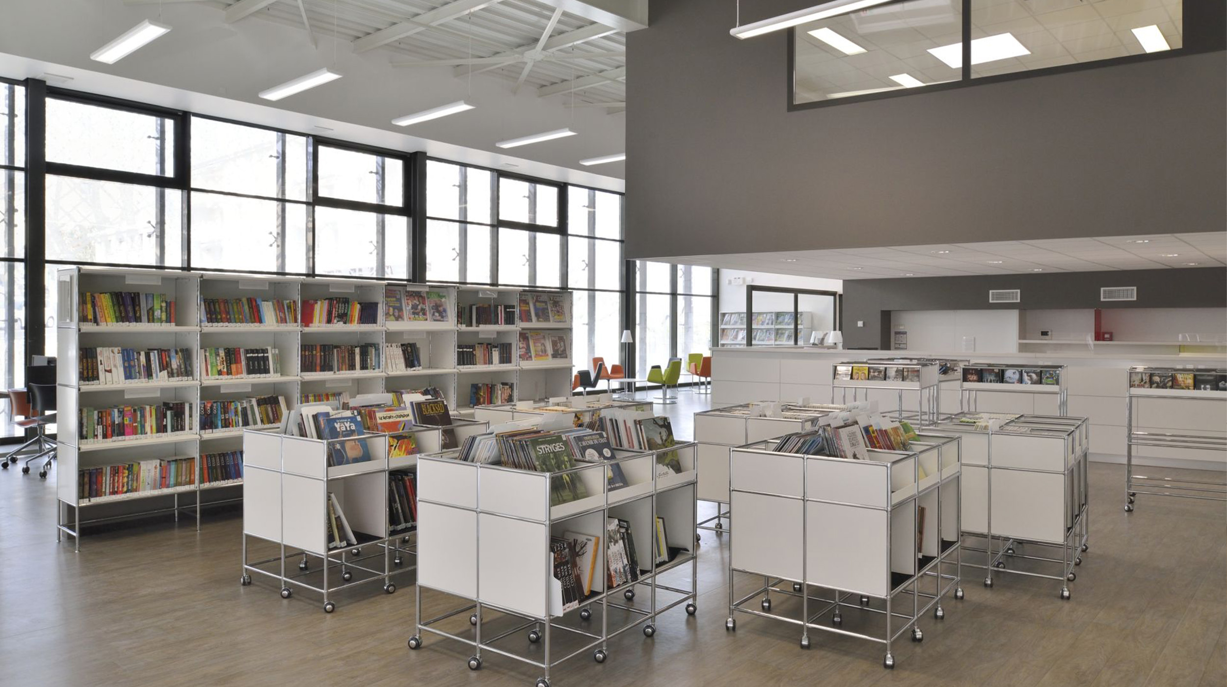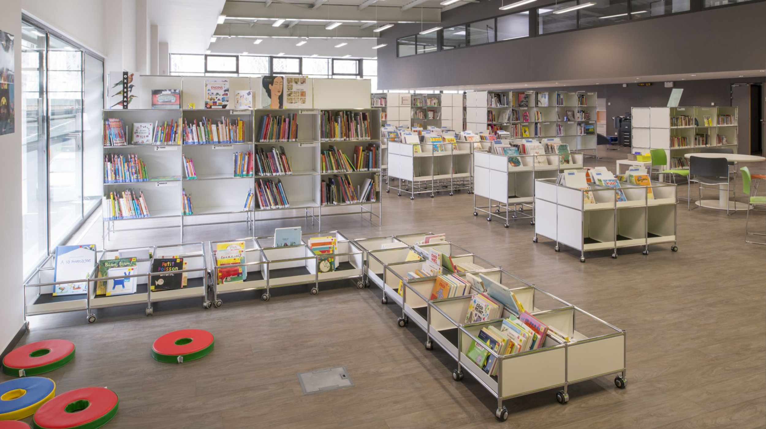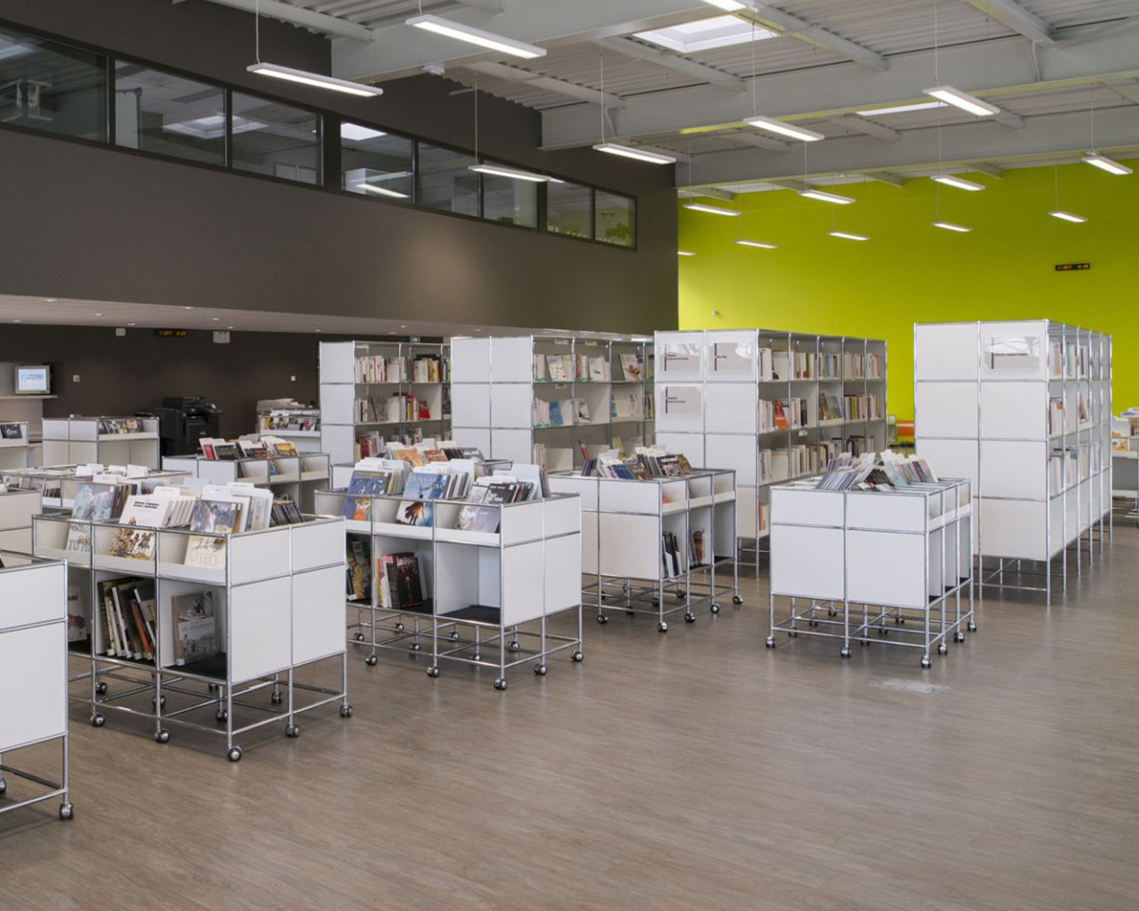 Es schafft übersichtlichen Stauraum für Bücher und Medien und gliedert die Mediathek in klare, offene Bereiche für Lernen, Lesen und Austausch.