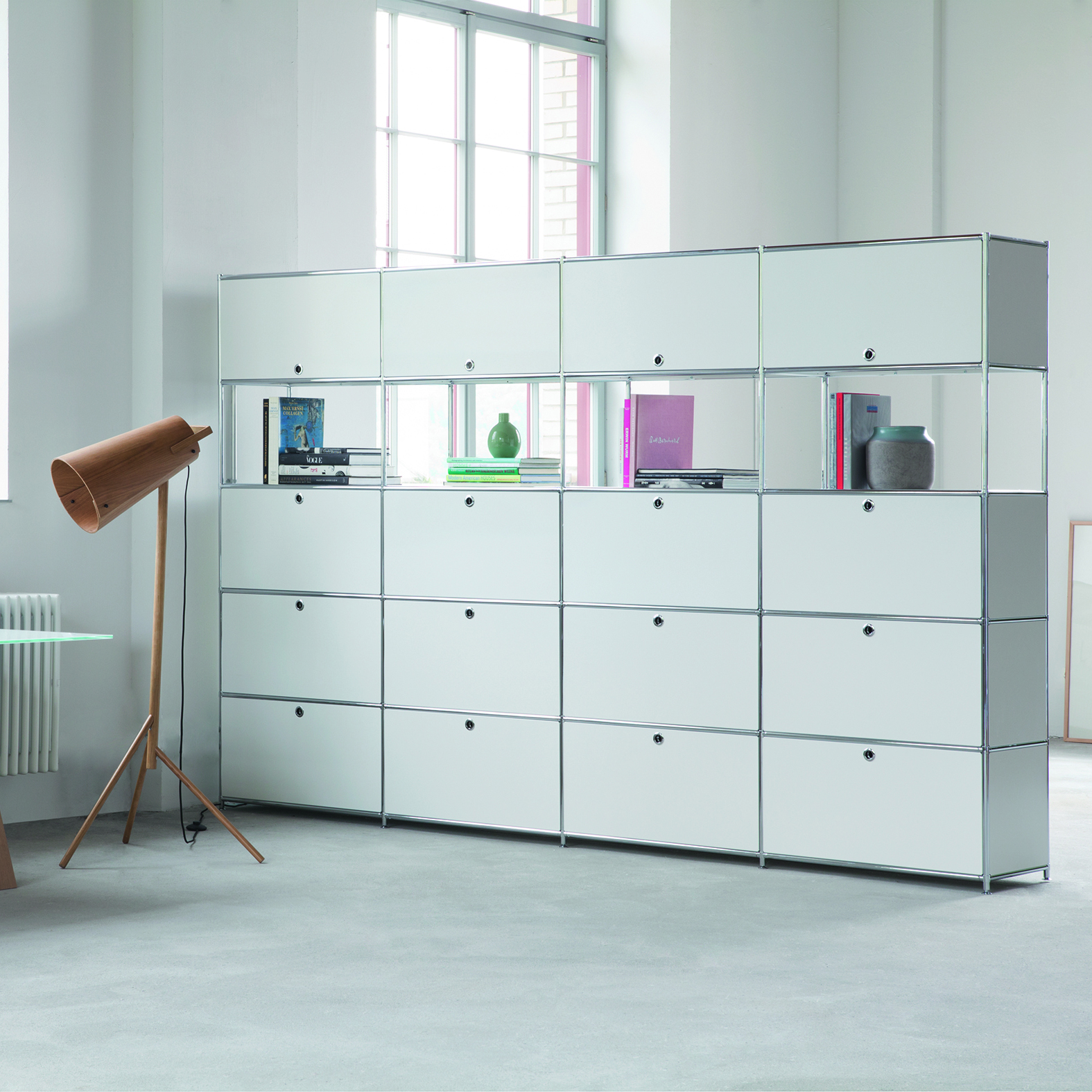Regal / Raumtrenner mit sechs Schubladen, drei Klappen nach unten öffnend, Lochgriffe verchromt und sechs offenen AblagenGewicht: 210 kg Belastbarkeit: Paneele (Füllungen) 50 kg, Schubladen 35 kg Gestänge: verchromte Stahlrohre Paneele (Füllungen): pulverbeschichtetes Metall Justierbare Stellfüsse