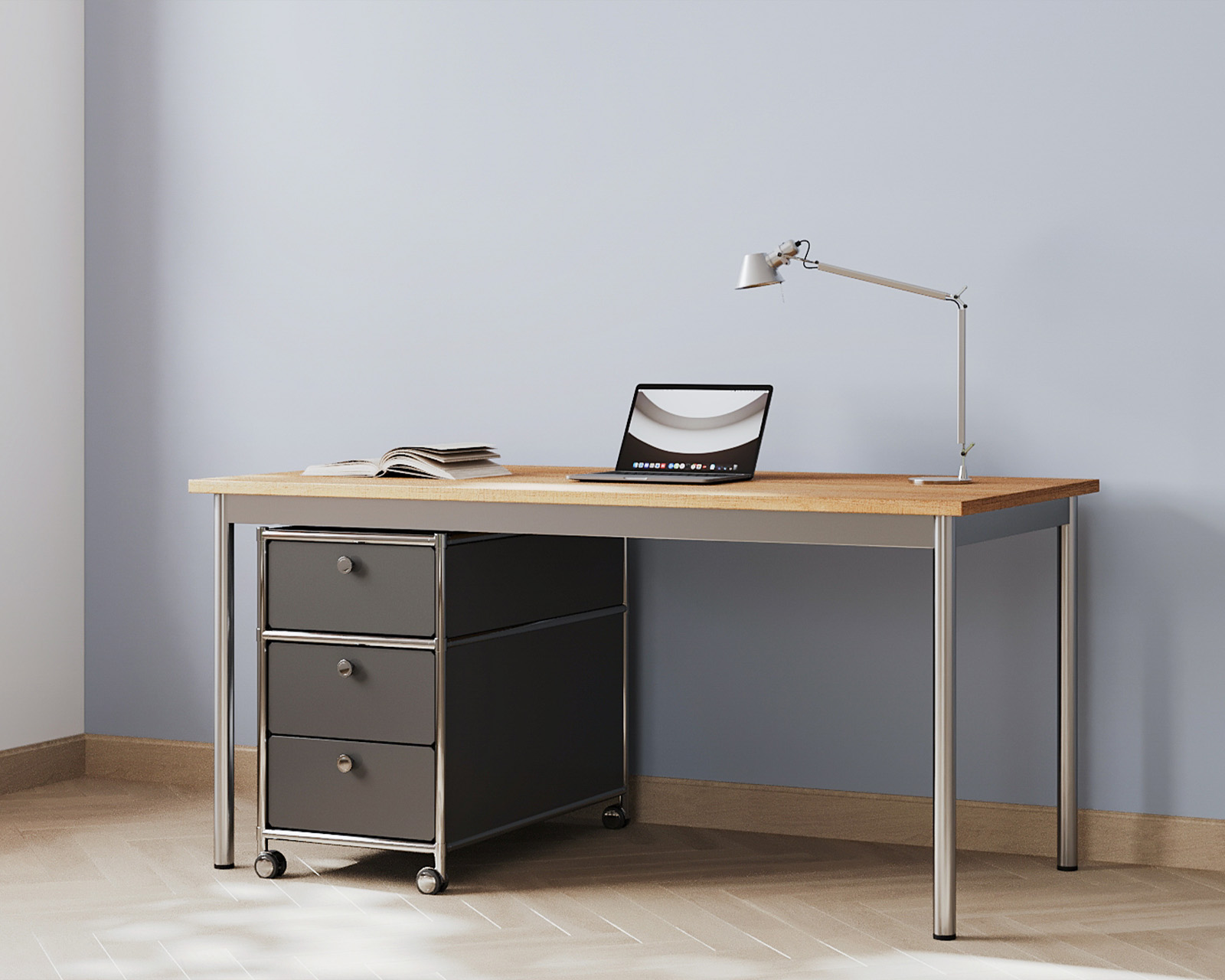 Schreibtisch mit zwei Schubladen, Frontgriffe verchromt und einer offenen AblageGewicht: 40.4 kg Belastbarkeit: Paneele (Füllungen) 50 kg, Schubladen 35 kg Gestänge: verchromte Stahlrohre Paneele (Füllungen): pulverbeschichtetes Metall Justierbare Stellfüsse